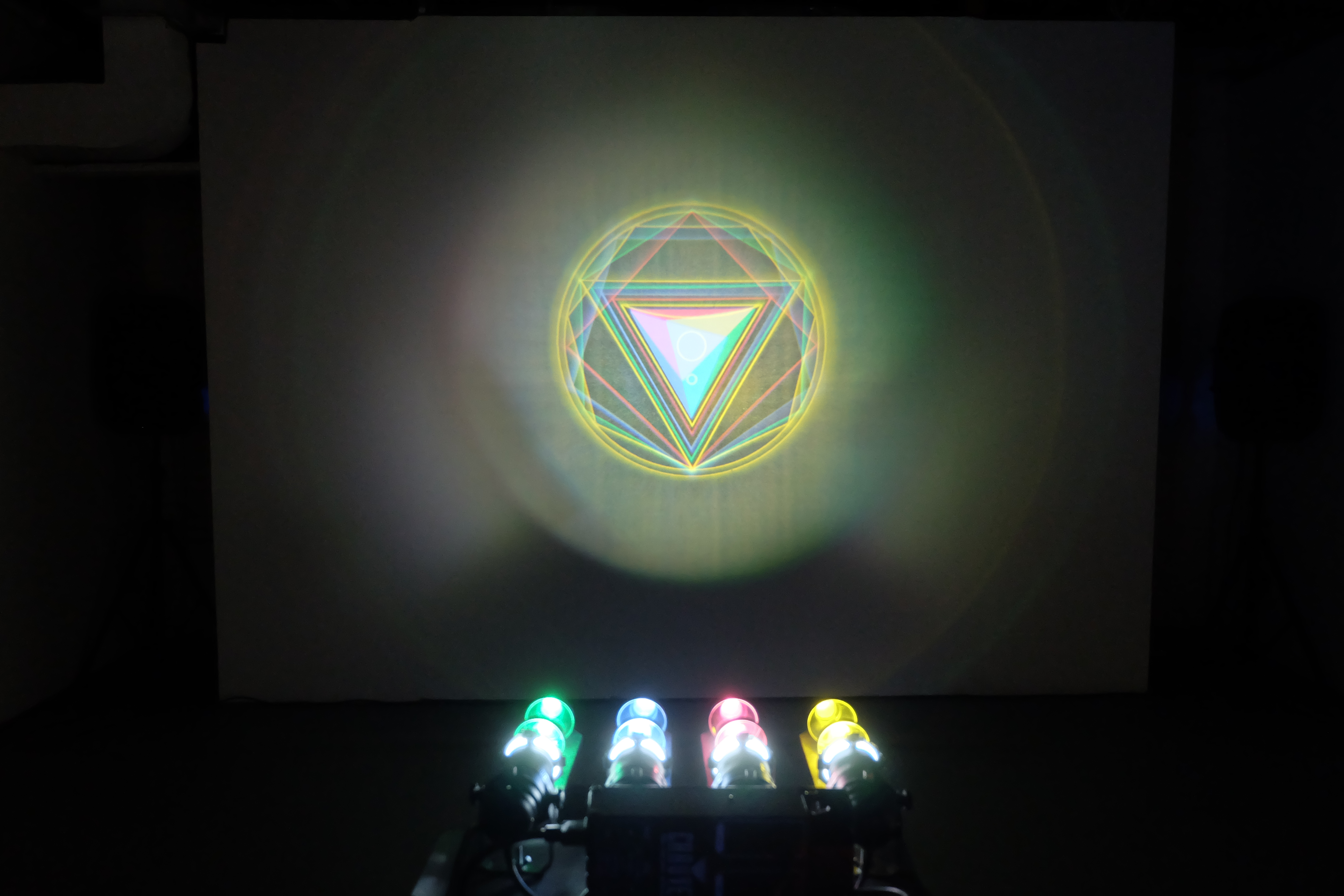 An Invocation for the Solstice uses analog projectors to engage the possibilities of additive light. Theatrical lighting equipment adds a time-based component and allows the juxtaposition of multiple geometries throughout a cycle. The shapes in the center of the piece are iconographic representations of the sun (a massive curve relative to the other bodies), the Earth (in the center) and the Moon (which is portrayed in syzygy to the other celestial bodies).