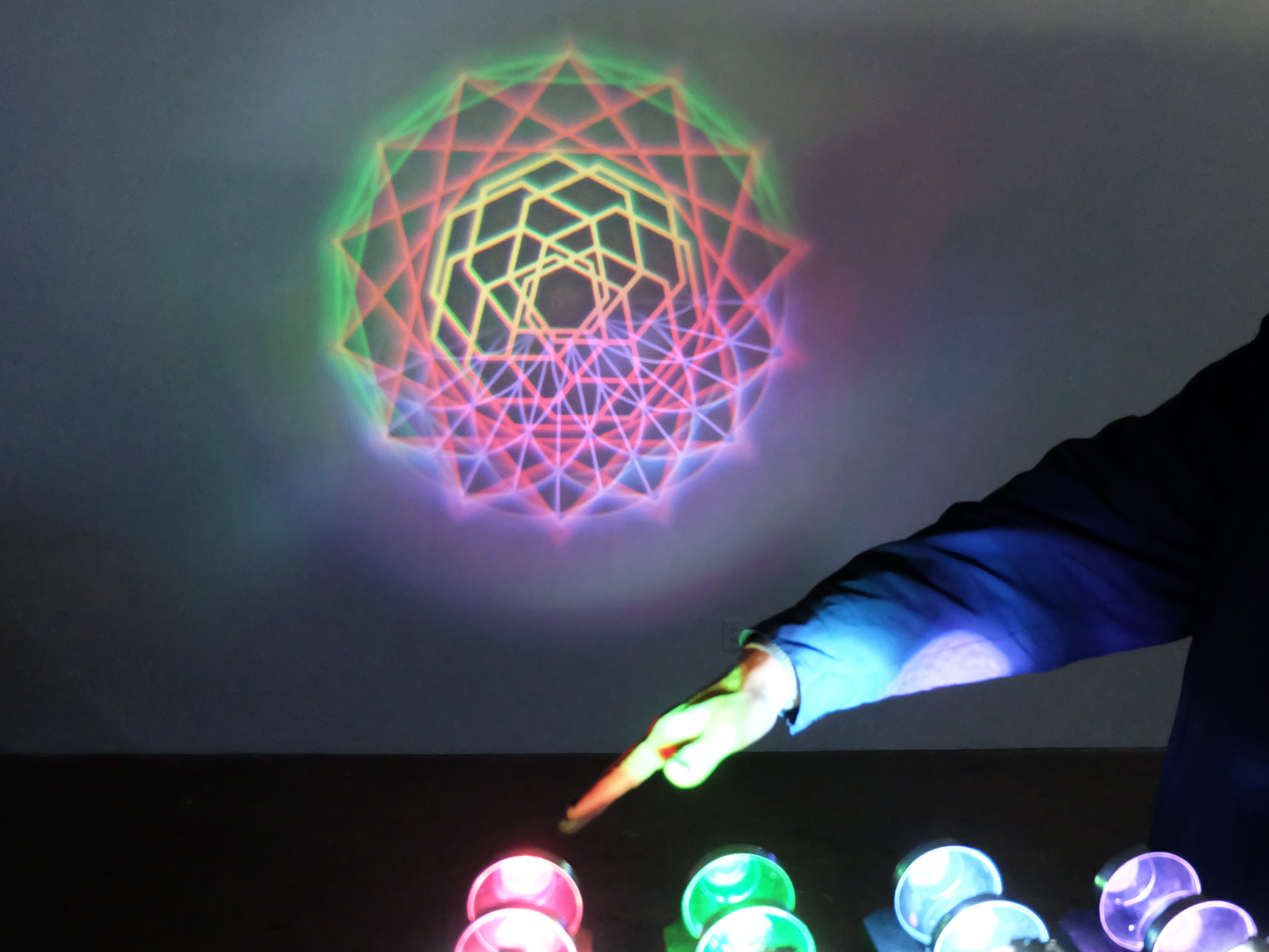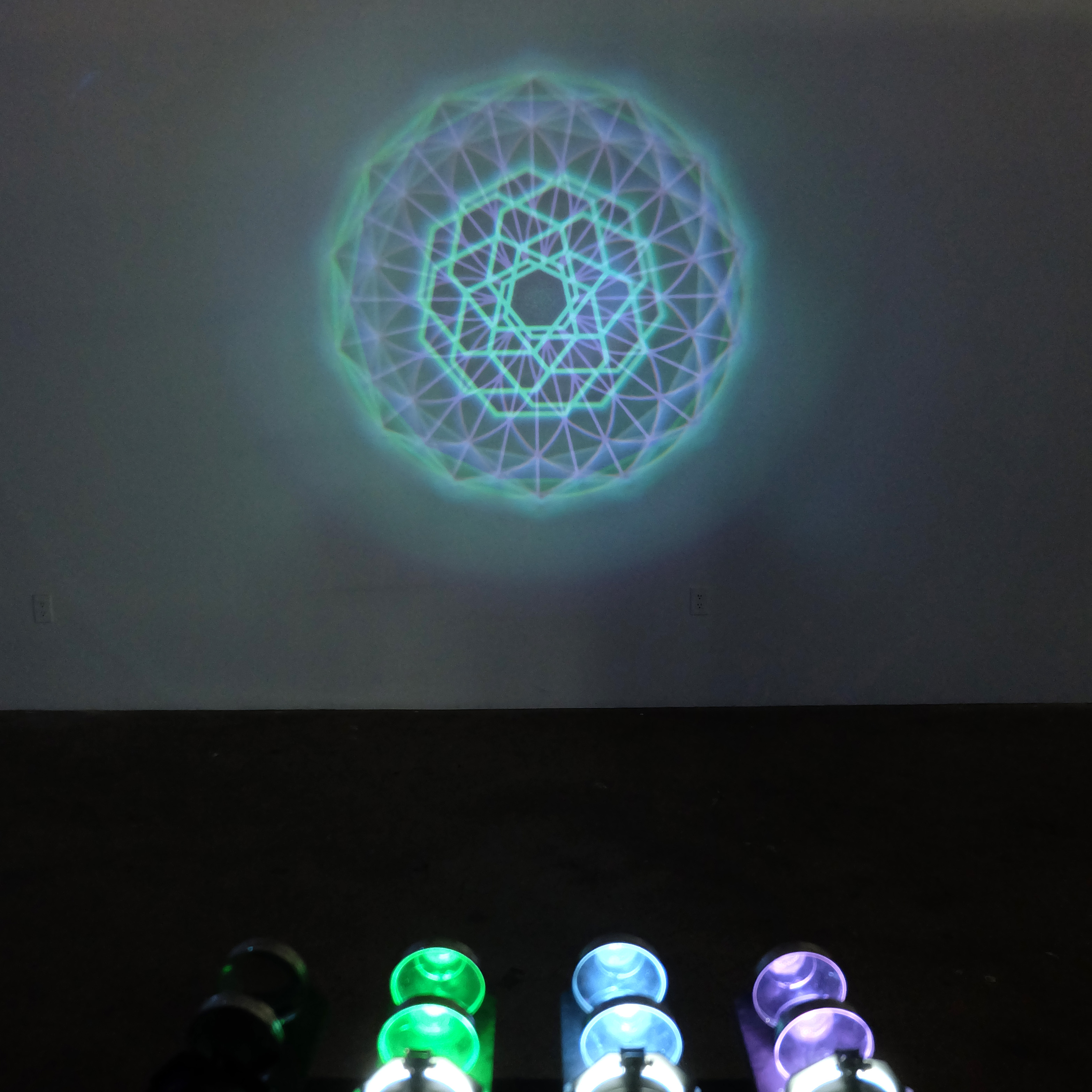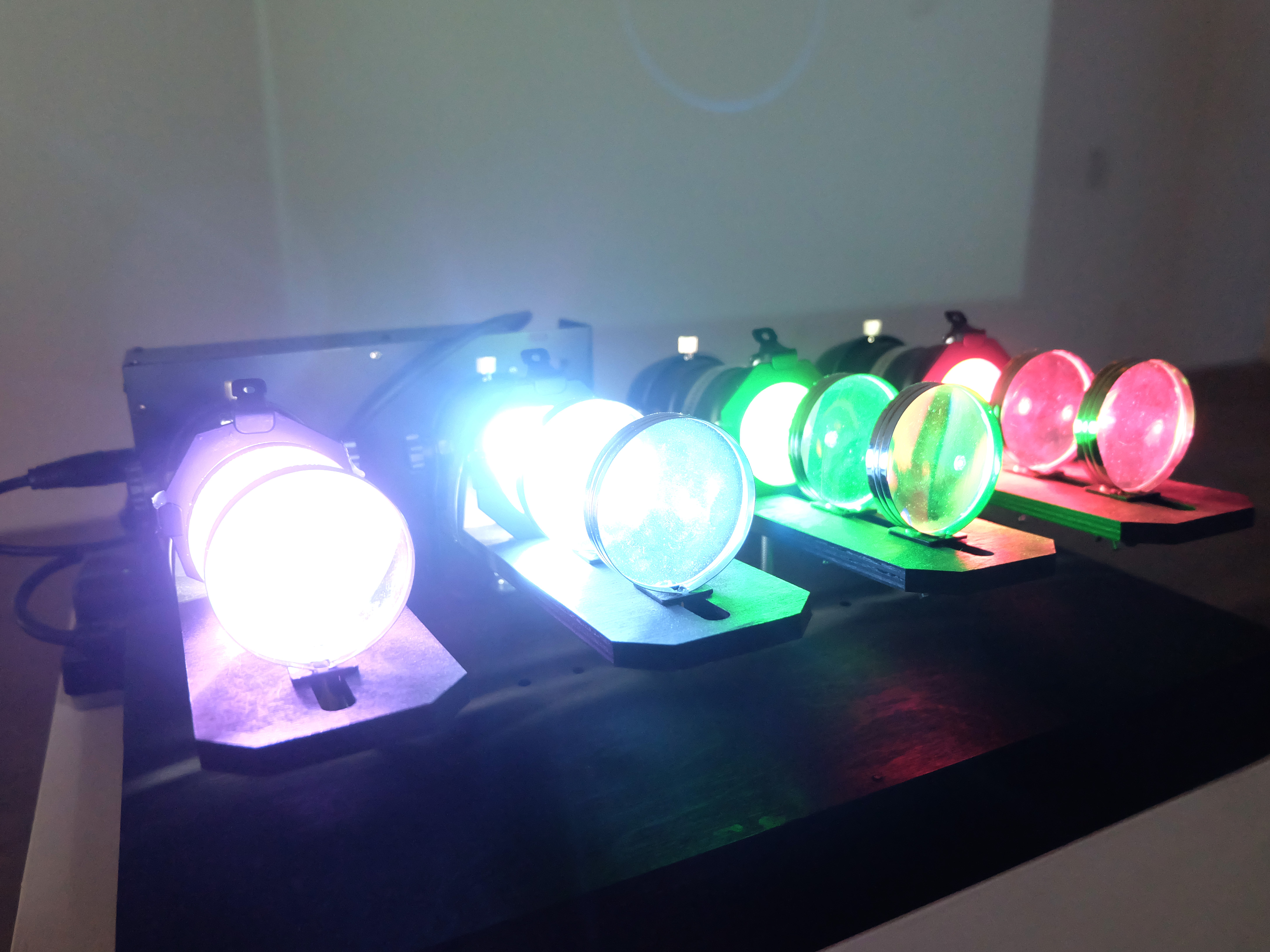 Lightbulbs, acrylic, transparency film, glass, wood, electronics.
