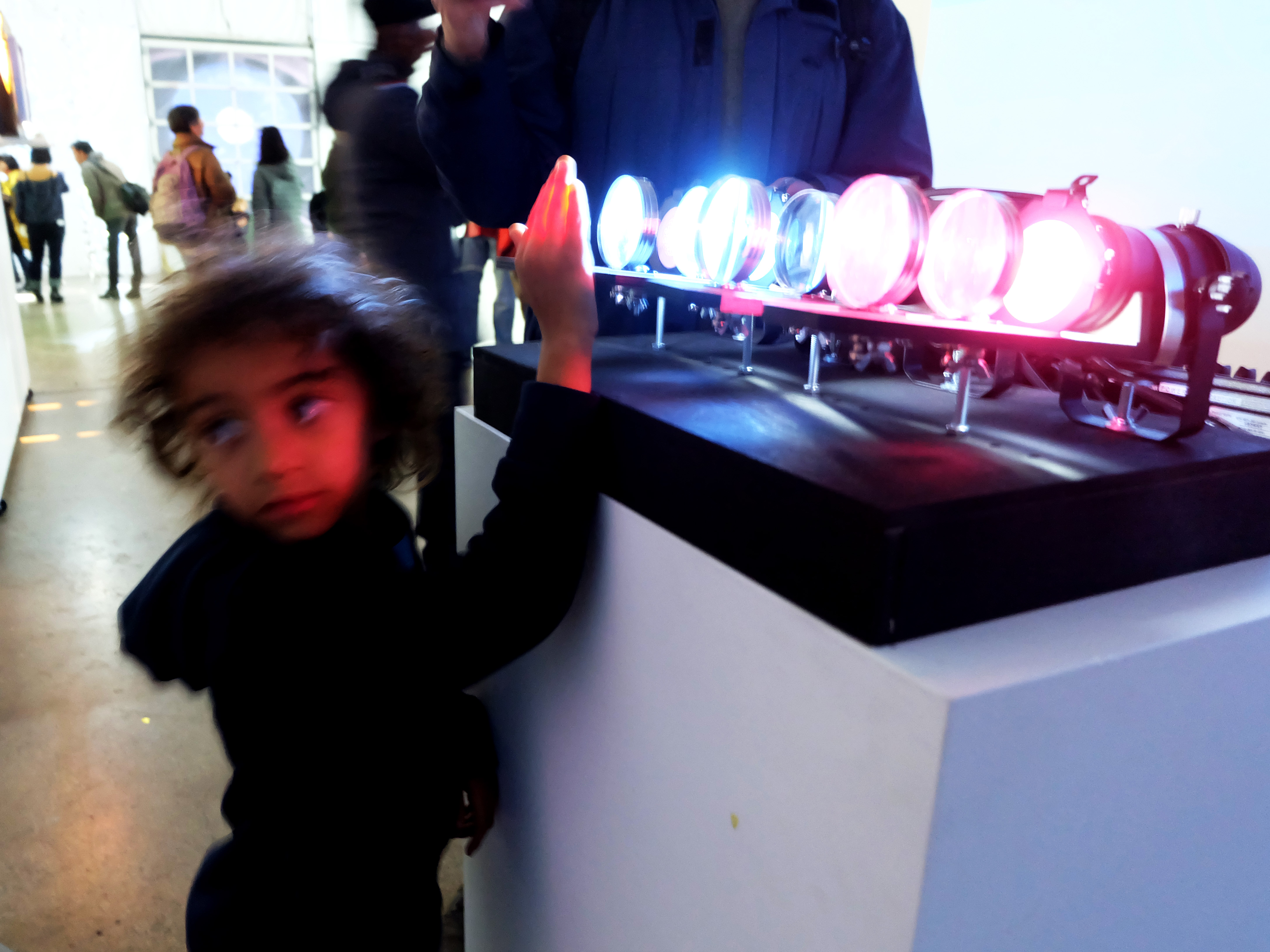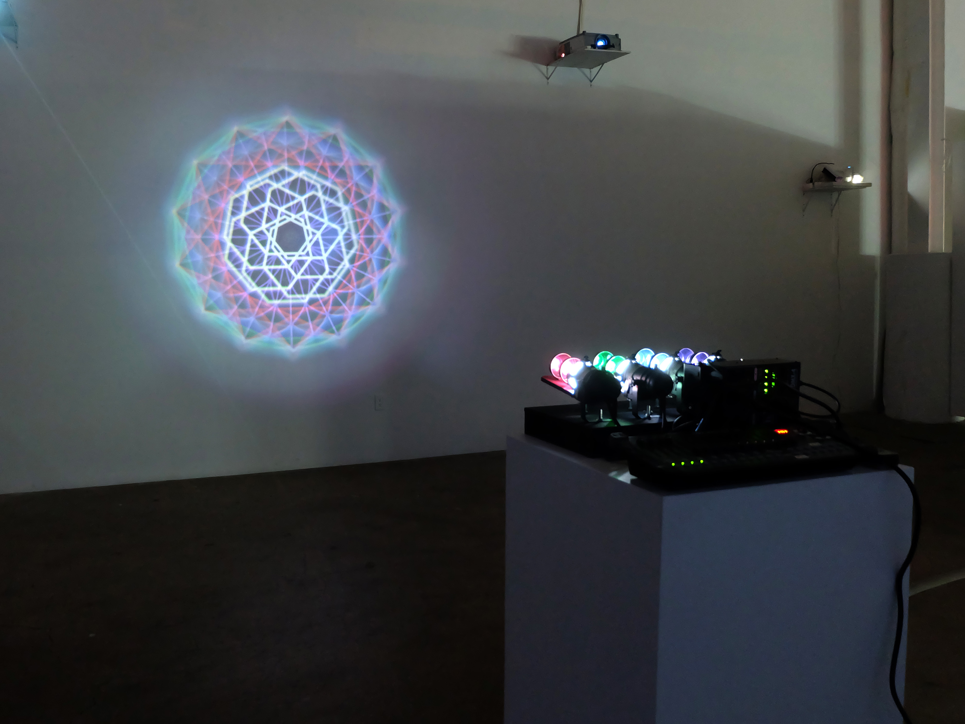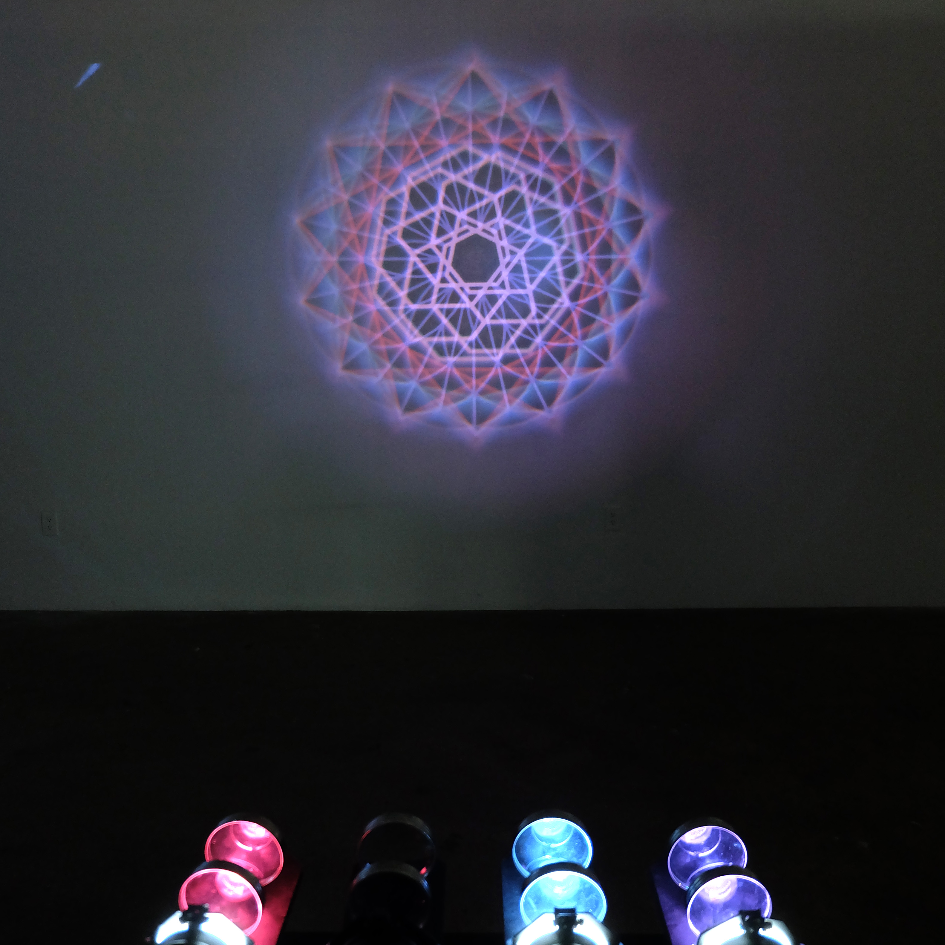 Lightbulbs, acrylic, transparency film, glass, wood, electronics.