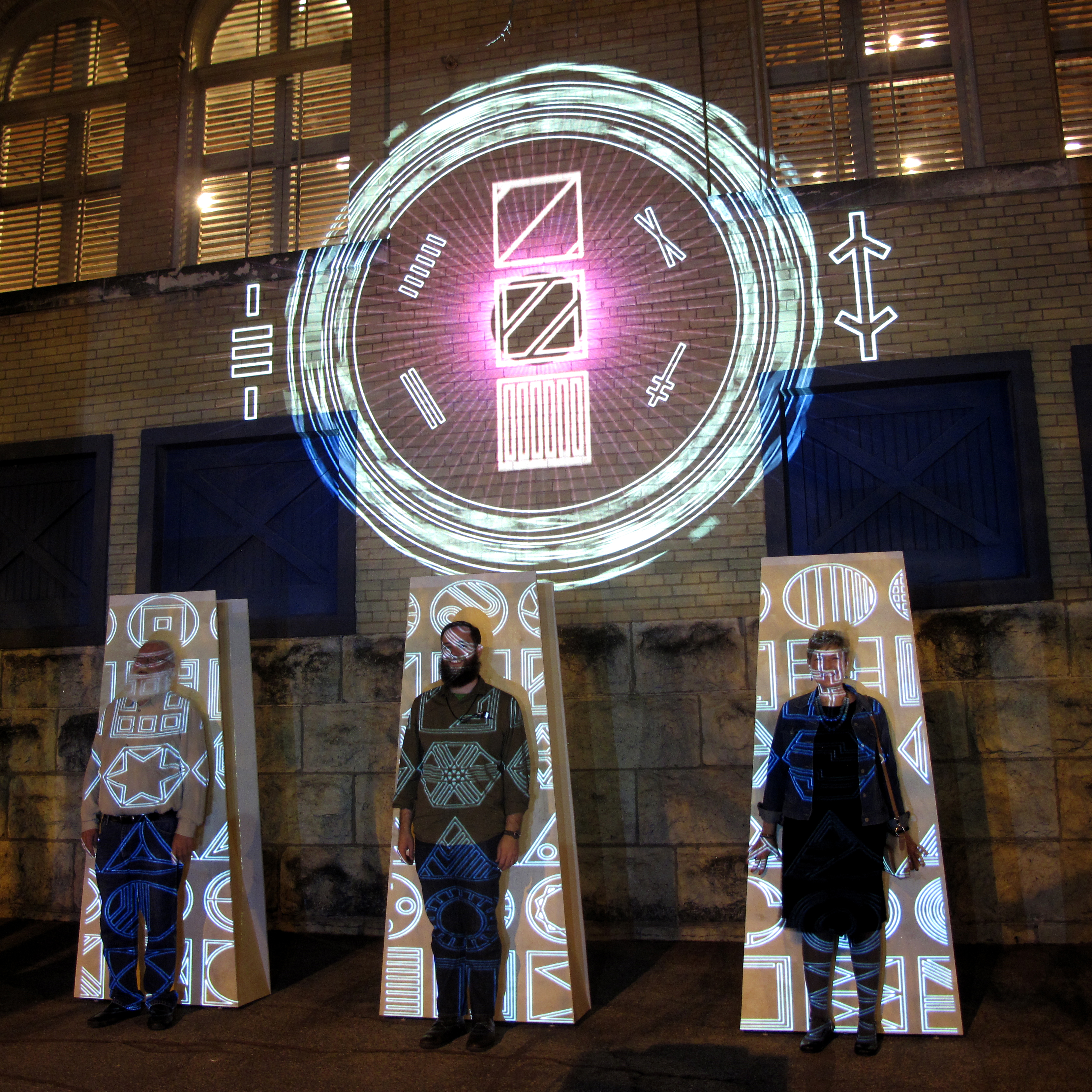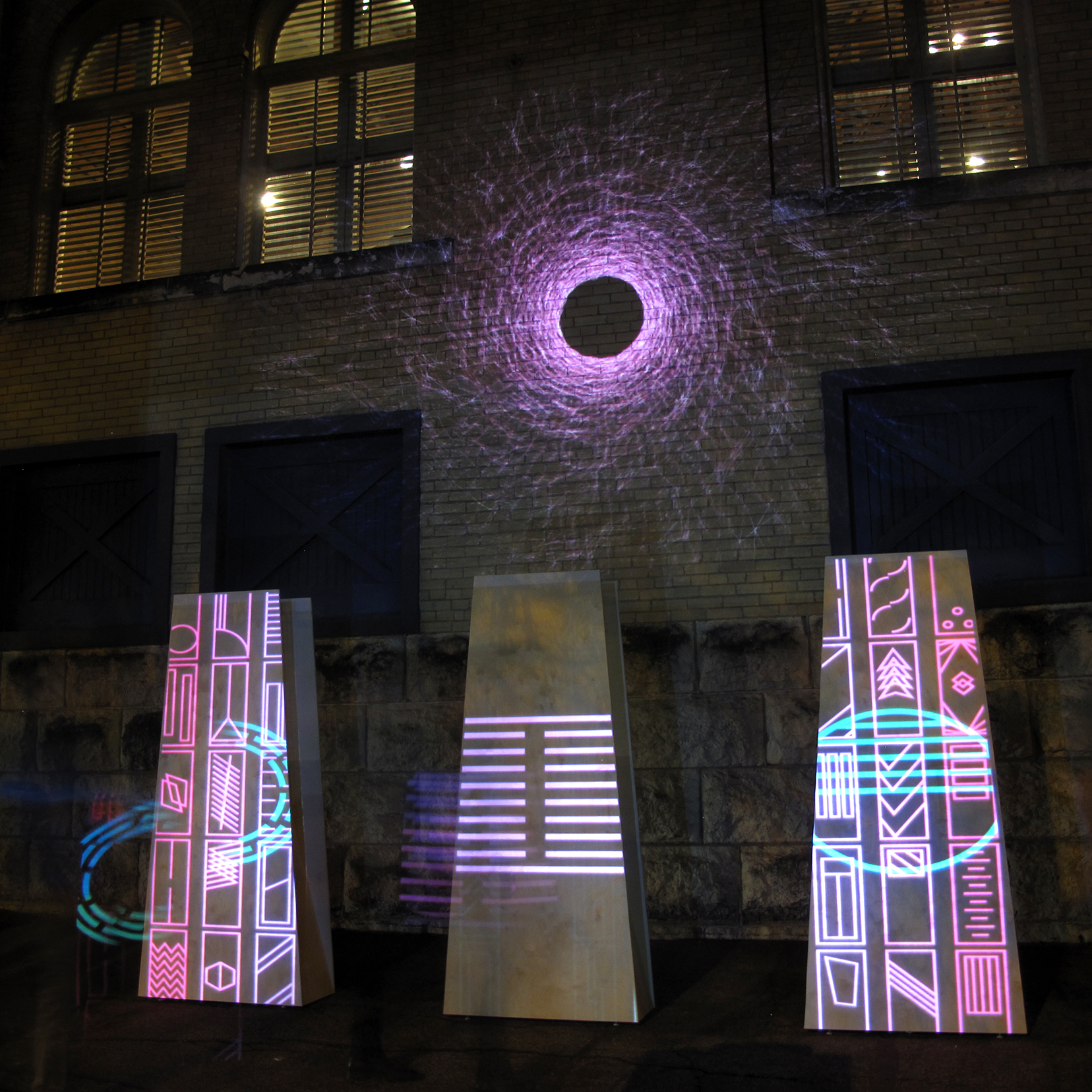 A Conjuration was presented on a single night in February of 2016 at the Luminaria Arts Festival in San Antonio, Texas. It was composed of two ancient symbols of spirituality and devotion: the mandala, a two dimension radial device used for meditation and spiritual focus, and three standing menhirs, obscure and primitive structures which are thought to have served as monuments to divinity or the supernatural. These components are bathed in projection mapped animations that feature my abstract imagery and asemic glyphs. The total effect of the piece was to experience a “conjuring” of some kind, though it is up to the viewer and audience to determine what, if anything, is being accomplished by the interaction of these images.