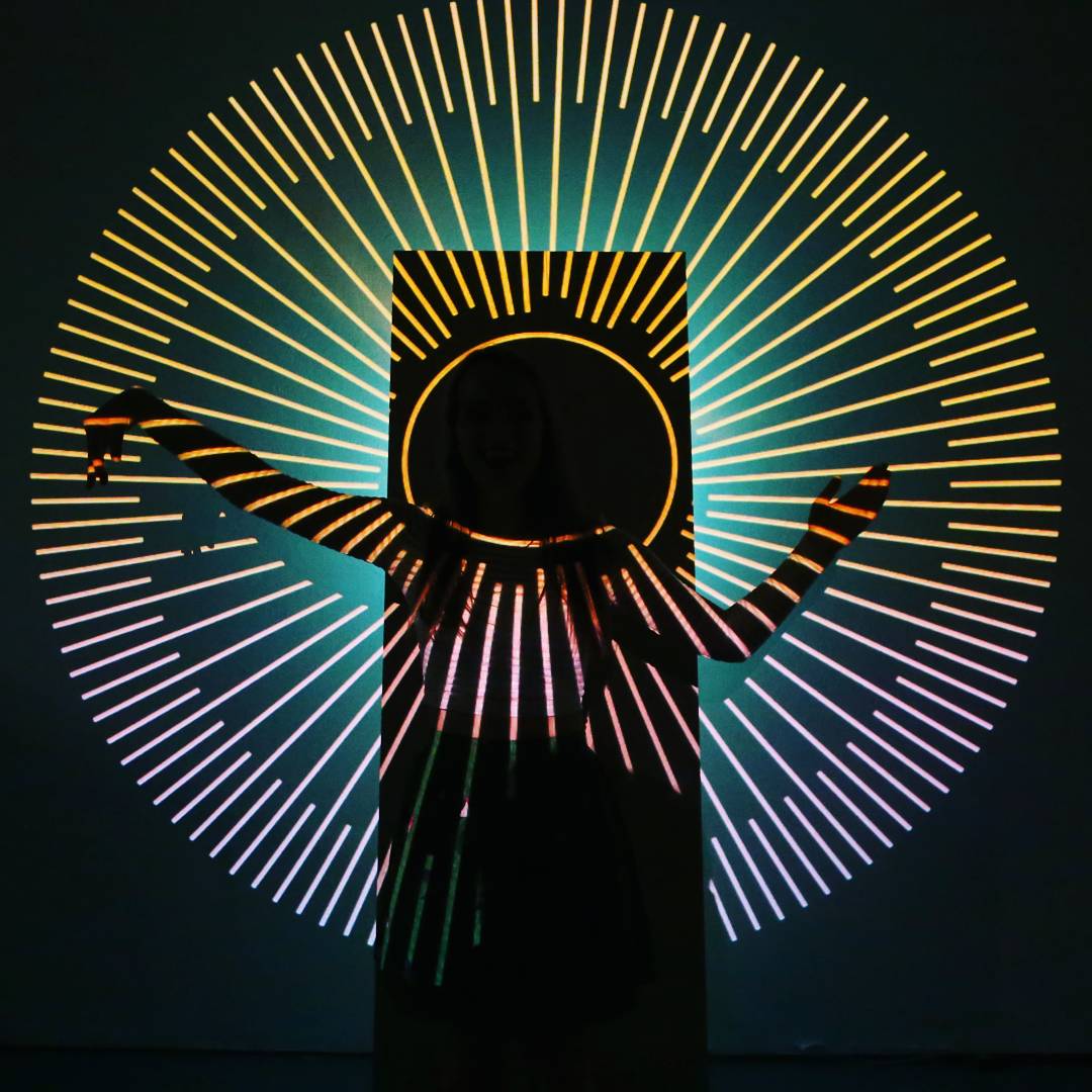 Digital projection, wood, plastic, lightbulb, fabric scrim, acrylic on canvas, three color screenprint.